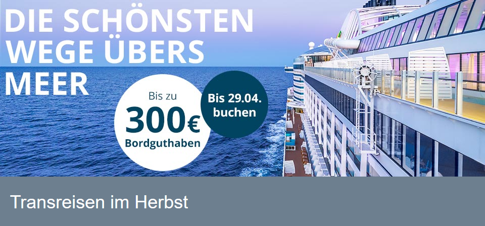 Buchen Sie jetzt Ihre AIDA Transreise für den Herbst 2019. Bis zu 300 Euro Bordguthaben versüßen Ihnen den Aufenthalt auf den Schiffen. Das AIDA Bordguthaben ist während der Reise vielfältig einsetzbar. So zum Beispiel für Ihre Ausgaben an den Bars oder auch für die zahlreichen Wellness Angebote. Alle Preise sind VARIO Preise, die Kabinenzuteilung erfolgt daher in der von Ihnen gewählten Kategorie erst nach der Buchung durch AIDA Cruises.
