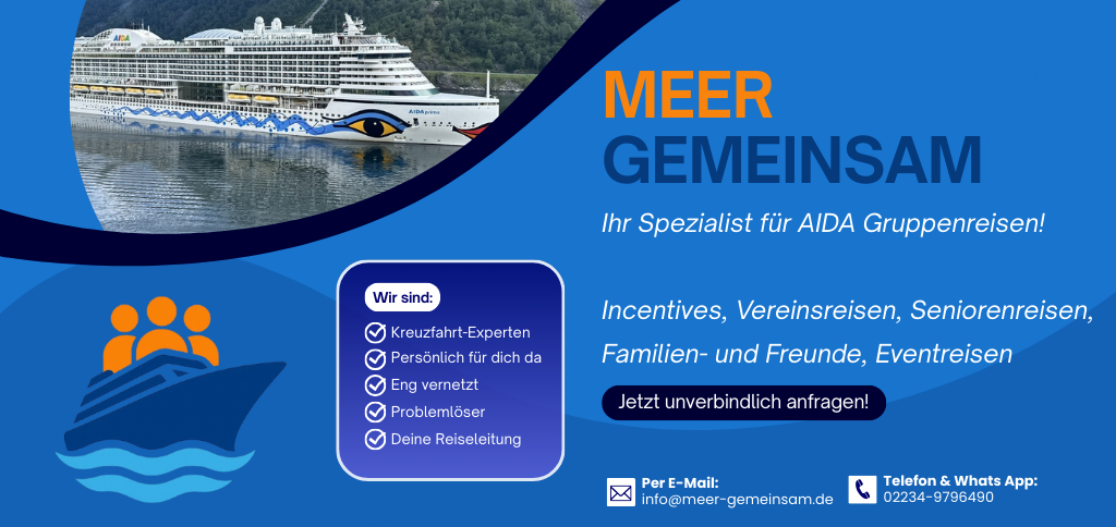 Erfüllen Sie sich und Ihrer Gruppe einen unvergesslichen Kreuzfahrttraum – mit AIDA und Meer Gemeinsam an Ihrer Seite. Ob Vereinsfreunde, Kolleg:innen, ganze Firmenmannschaften oder enge Familienkreise: Wir gestalten Ihre Gruppenreise so, dass alle zusammen entspannen, staunen, entdecken und genießen können.