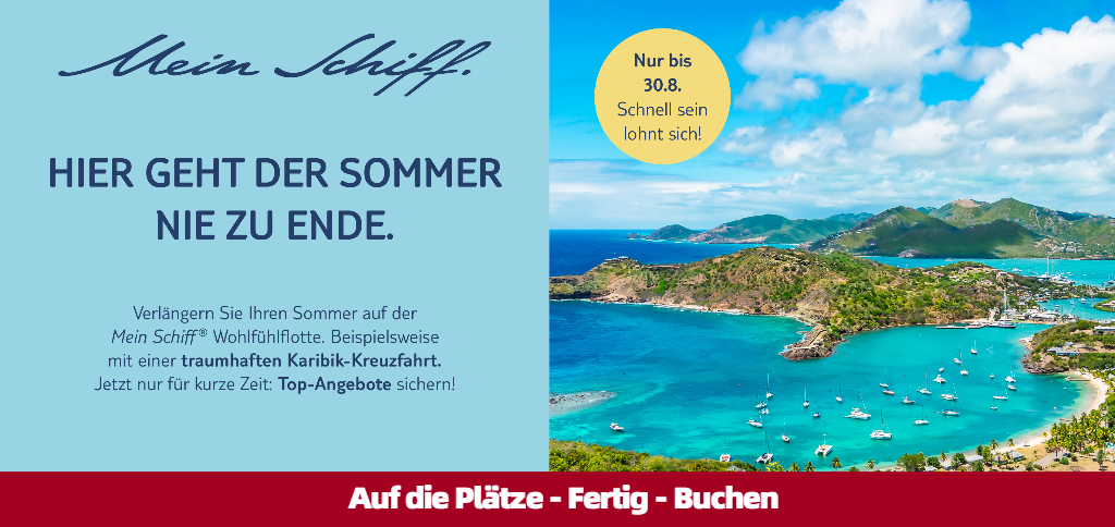 Auf die Plätze – Fertig – Buchen: Sichert euch bis zum 30.08. unschlagbare Angebote im Winter 2022/2023! Der Einzelzuschlag liegt bei nur 40 % (ausgenommen Karibische Inseln I und Karibik & Mittelamerika I).