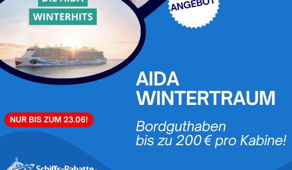 Nur vom 05.06. bis 23.06.2025 gibt’s auf vielen Mittelstrecken-Reisen im Winter 2025/26 ein Bordguthaben bis zu 200 € pro Kabine!