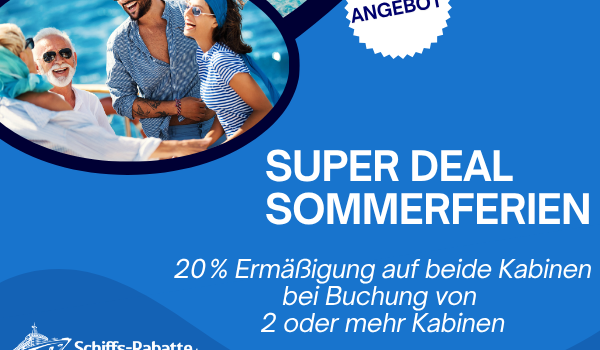 20 % Ermäßigung auf beide Kabinen bei Buchung von 2 oder mehr Kabinen – bei nur 2 Personen in der 1. Kabine!