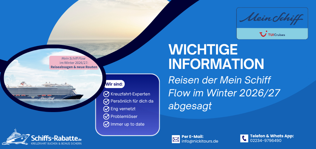 aufgrund der anhaltenden Situation im Nahen Osten wird die Mein Schiff Flow in der Wintersaison 2026/2027 nicht wie geplant im Orient bzw. auf den Überführungsfahrten rund um Afrika eingesetzt.