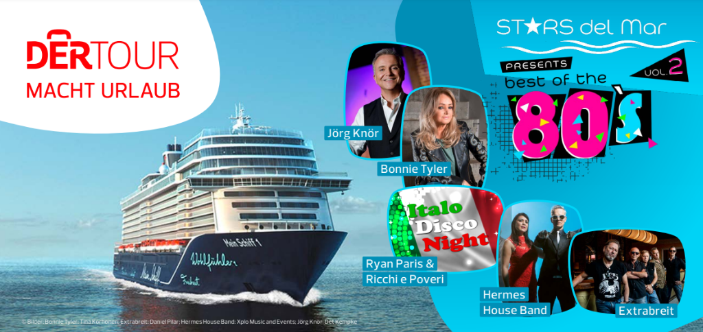 Die Event-Kreuzfahrt Stars del Mar wird auch 2023 eine unvergessliche 80er Mottoparty. Mit „best of the 80’s Vol. 2″ reisen Sie an Bord der Mein Schiff 1 zurück in dieses schrille Jahrzehnt. Entertainer Jörg Knör präsentiert tolle Acts, wie Bonnie Tyler, Extrabreit und die Hermes House Band.